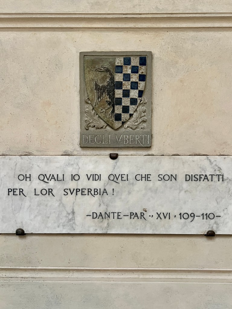 Florence likes to immortalize Dante’s words as a moral lesson. Here, the Ubèrti’s coat of arms is displayed almost as a warning: once they were powerful, now they are remembered chiefly as a case study in superbia punished.