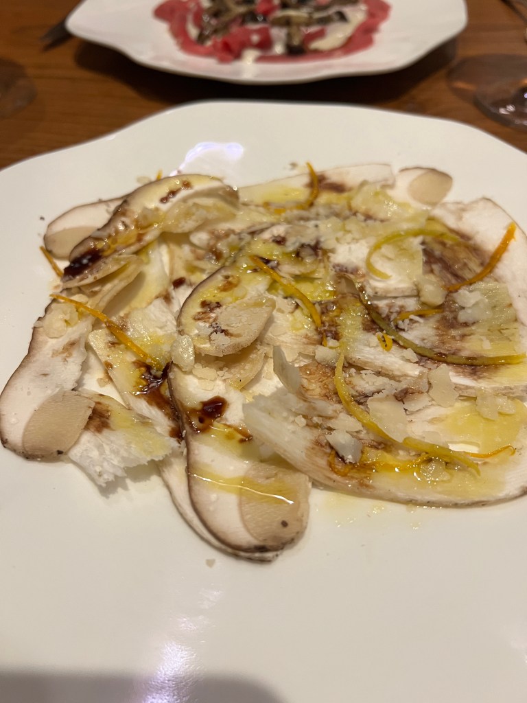 As you might guess, Porcini Carpaccio isn’t a difficult dish — but it does require care. The mushrooms must be absolutely fresh, sliced paper-thin (no small feat with their tender flesh). The dish was dressed with a hint of orange zest, fine olive oil, and an exquisite balsamic vinegar, then finished with a sprinkle of freshly grated Parmesan.